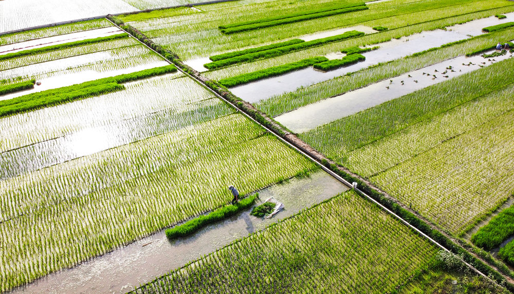 2020年6月14日,農(nóng)民在洛陽(yáng)市孟津縣會(huì)盟鎮(zhèn)黃河岸邊的萬(wàn)畝優(yōu)質(zhì)水稻種植示范基地內(nèi)移栽水稻秧苗(無(wú)人機(jī)照片)。新華社發(fā)(黃政偉 攝)