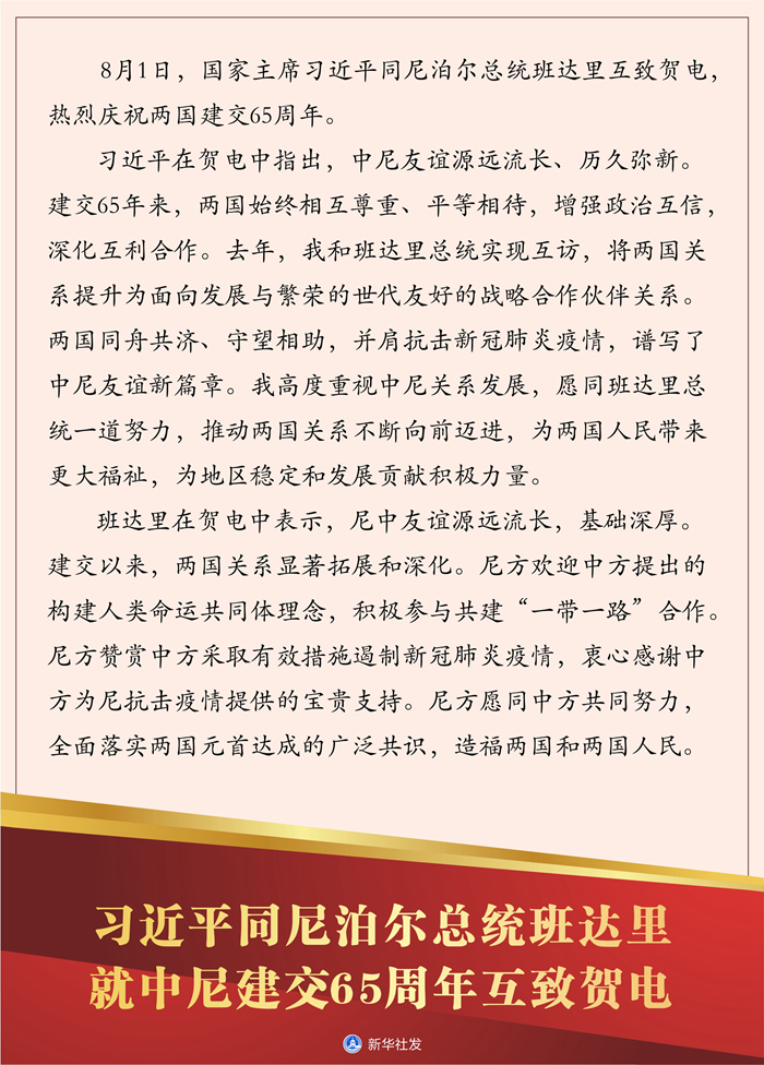 習(xí)近平在賀電中指出,中尼友誼源遠(yuǎn)流長、歷久彌新。建交65年來,兩國始終相互尊重、平等相待,增強(qiáng)政治互信,深化互利合作。去年,我和班達(dá)里總統(tǒng)實(shí)現(xiàn)互訪,將兩國關(guān)系提升為面向發(fā)展與繁榮的世代友好的戰(zhàn)略合作伙伴關(guān)系。兩國同舟共濟(jì)、守望相助,并肩抗擊新冠肺炎疫情,譜寫了中尼友誼新篇章。我高度重視中尼關(guān)系發(fā)展,愿同班達(dá)里總統(tǒng)一道努力,推動(dòng)兩國關(guān)系不斷向前邁進(jìn),為兩國人民帶來更大福祉,為地區(qū)穩(wěn)定和發(fā)展貢獻(xiàn)積極力量。
