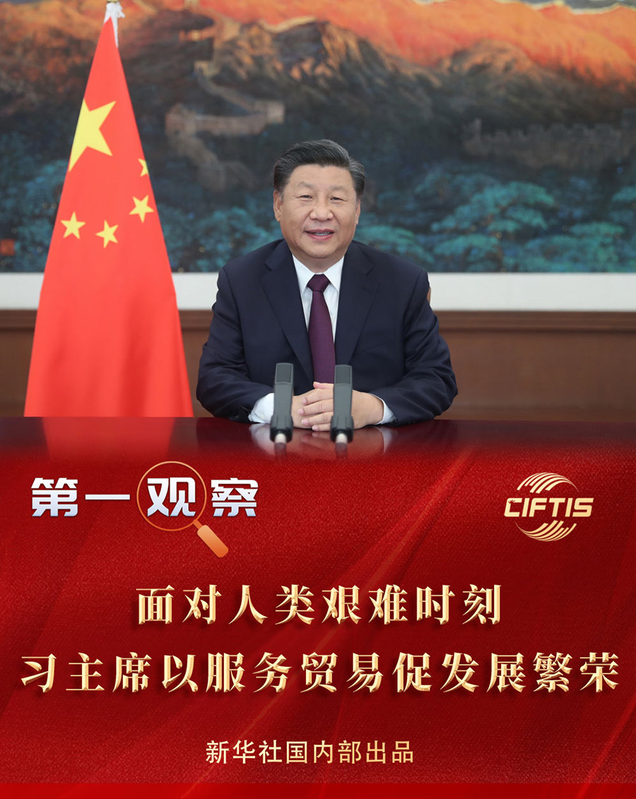 “希望以此為契機(jī),搭建起平臺和橋梁,讓各國人民充分展示服務(wù)貿(mào)易領(lǐng)域新發(fā)展新突破,共同享受人類社會(huì)發(fā)展進(jìn)步新技術(shù)新成果?!绷?xí)近平主席在致辭中說。