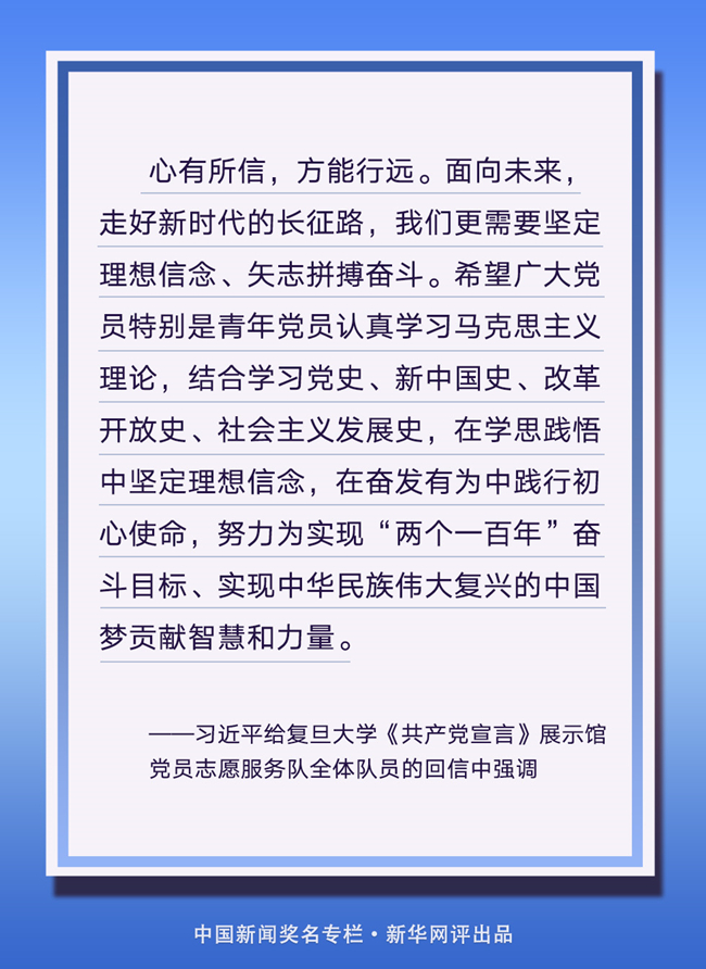 心有所信,方能行遠(yuǎn)。今天,歷史的接力棒傳到了我們手中。面向未來,走好新時代的長征路,我們更需要堅定理想信念、矢志拼搏奮斗,不斷創(chuàng)造新精彩,續(xù)寫新榮光。 (文字:徐可 海報:張倩)