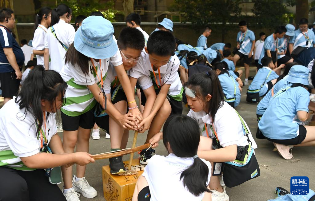 研学学生在西安半坡博物馆里体验钻木取火(8月9日摄)。
