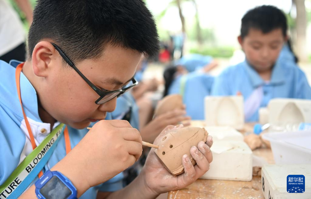 研学学生在西安半坡博物馆里制作陶埙(8月9日摄)。