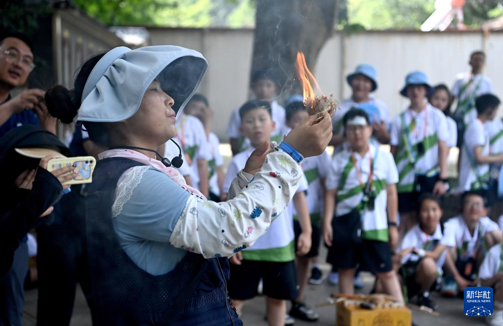 西安半坡博物馆的工作人员向研学学生展示钻木取火(8月9日摄)。