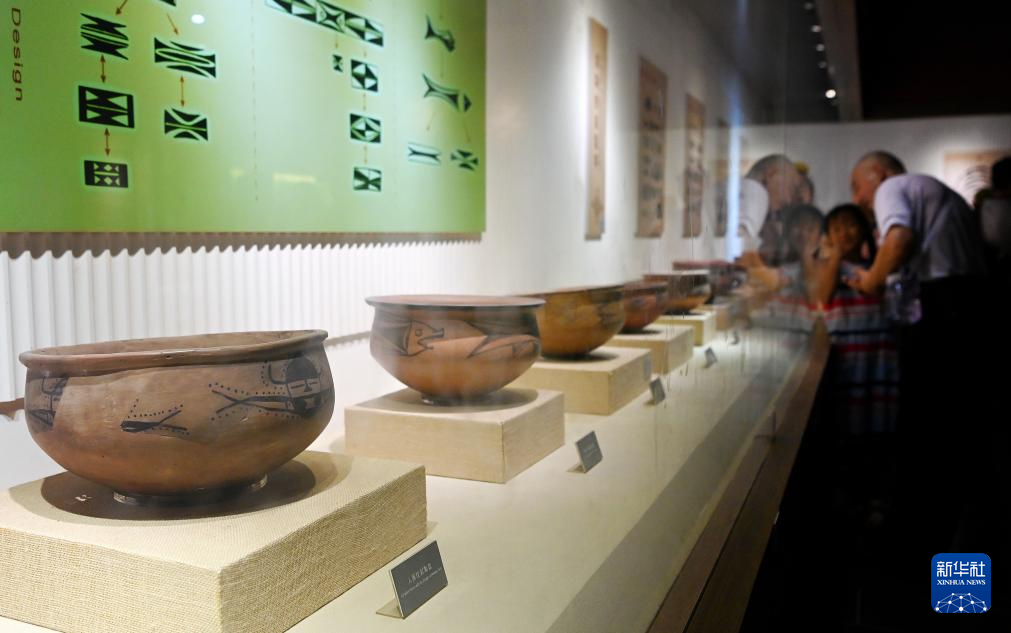 参观者在西安半坡博物馆里观看彩陶盆(8月9日摄)。