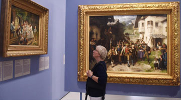 9月14日,观众参观陕西西安少陵原十六国大墓出土的骑马吹角俑和骑马击鼓俑。