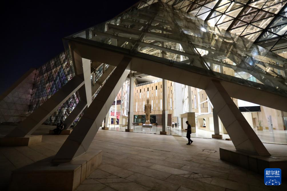 这是10月8日在埃及吉萨省拍摄的晚上亮灯的大埃及博物馆大厅。