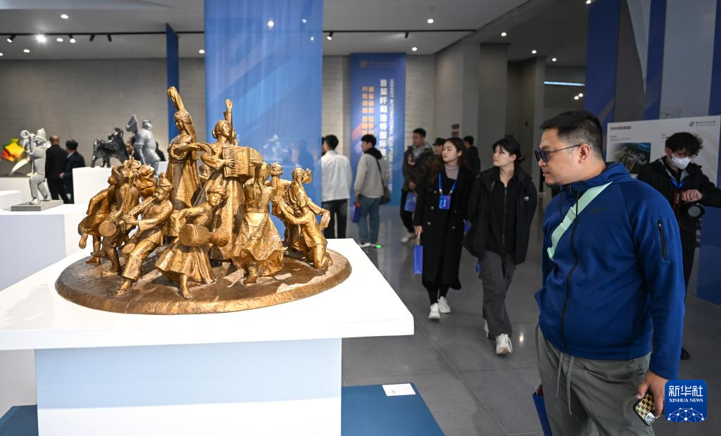 10月14日,观众在首届呼和浩特国际雕塑艺术展上观赏雕塑作品。