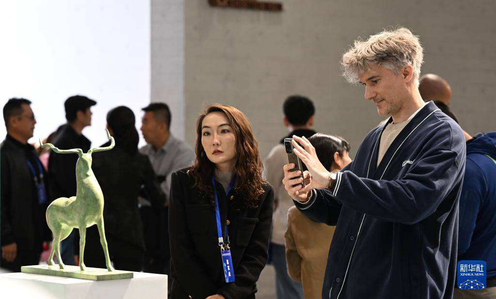 10月14日,观众在首届呼和浩特国际雕塑艺术展上拍摄雕塑作品。