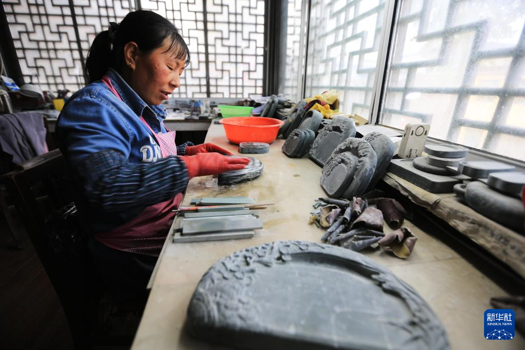 10月24日,艺人在甘肃省定西市临洮县洮砚艺术馆雕刻制作洮砚。