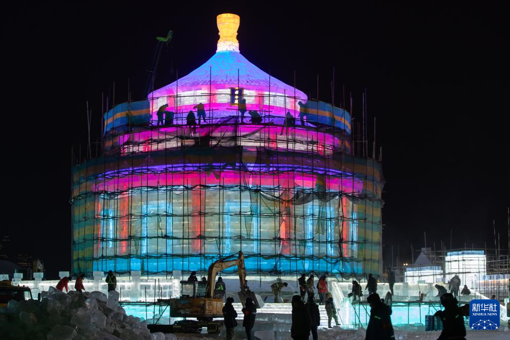 12月14日,工人在哈尔滨冰雪大世界园区建设现场施工。