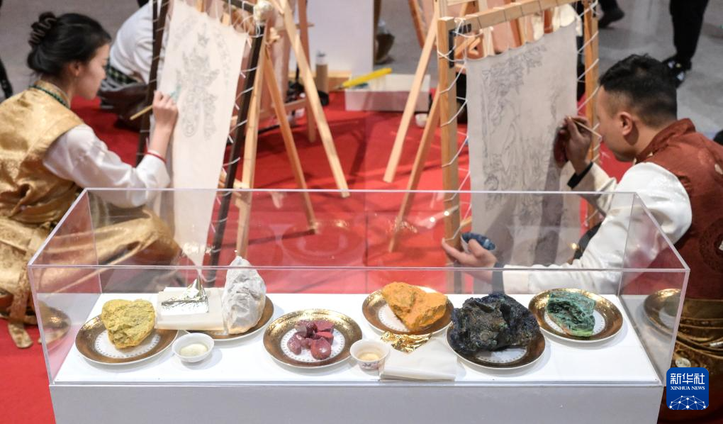 展览上展出了绘制传统热贡唐卡所需要的各种珍贵矿物颜料标本(12月27日摄)。