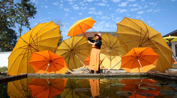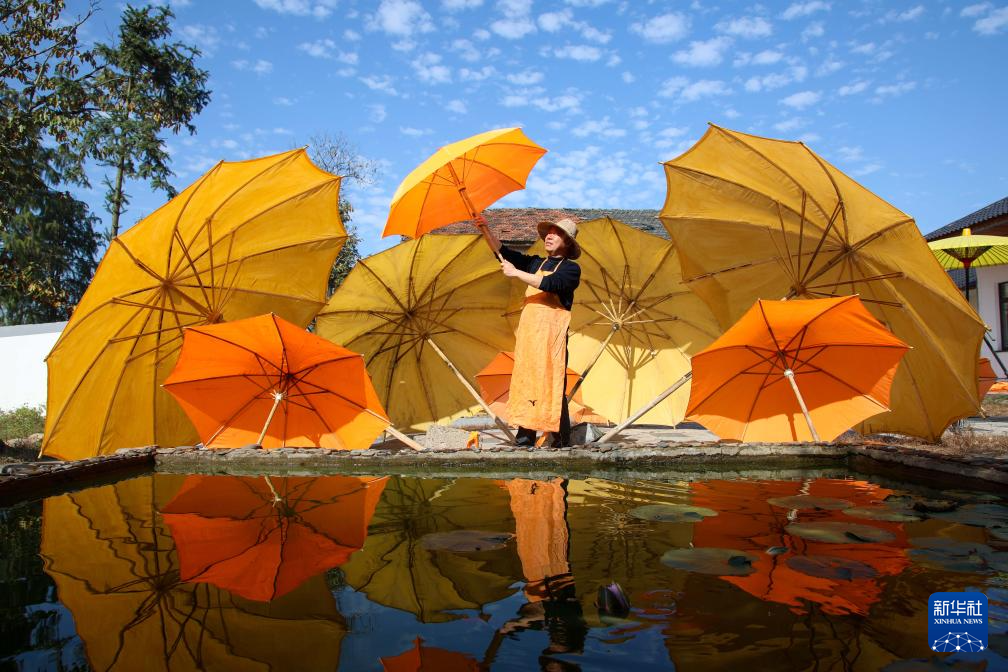 11月13日,在泾县昌桥乡孤峰村,国民油布伞厂的工人在晾晒油布伞。