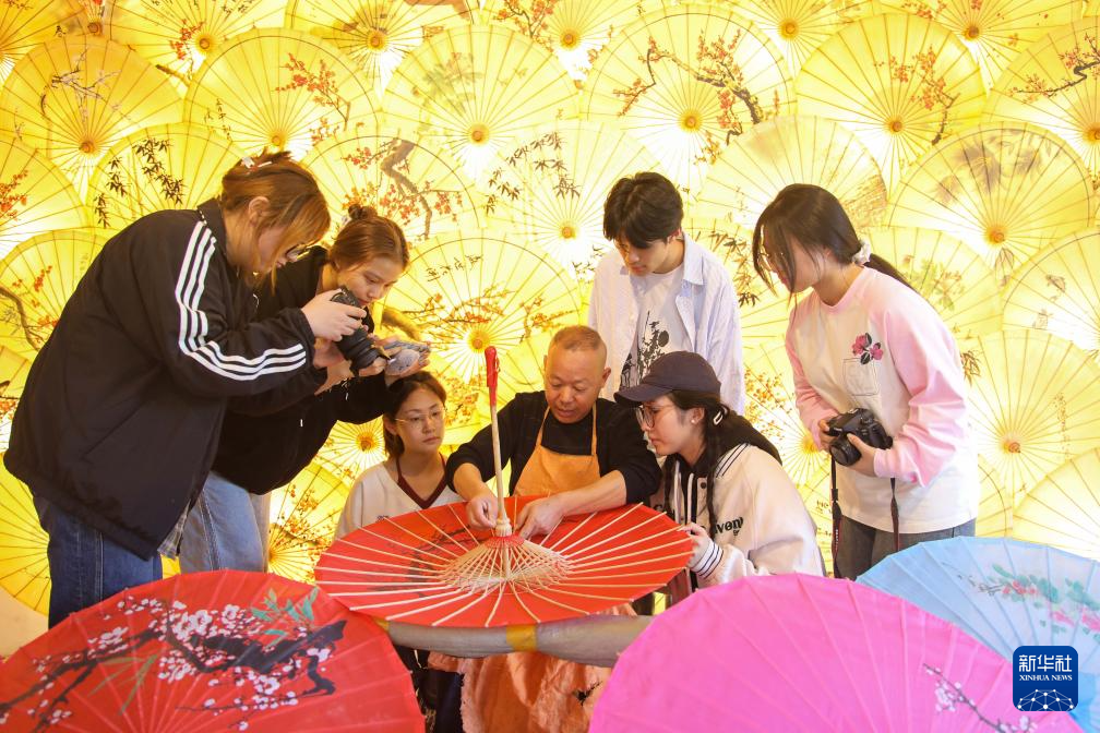 11月13日,在泾县昌桥乡孤峰村的国民油布伞厂,省级非物质文化遗产传承人郑国民为前来研学的学生介绍油布伞制作技艺。