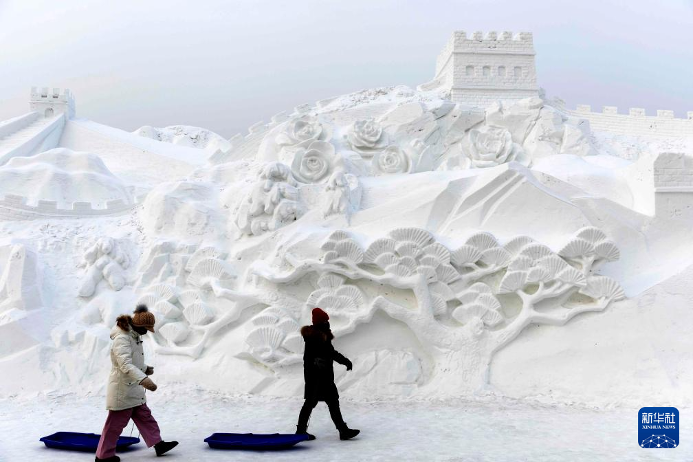 1月13日,在哈尔滨太阳岛雪博会园区,游客从大型长城雪雕下走过。