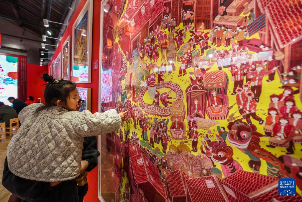 1月23日,一名小朋友在湖州吴兴的小西街西岸美术馆观赏年画美术作品。