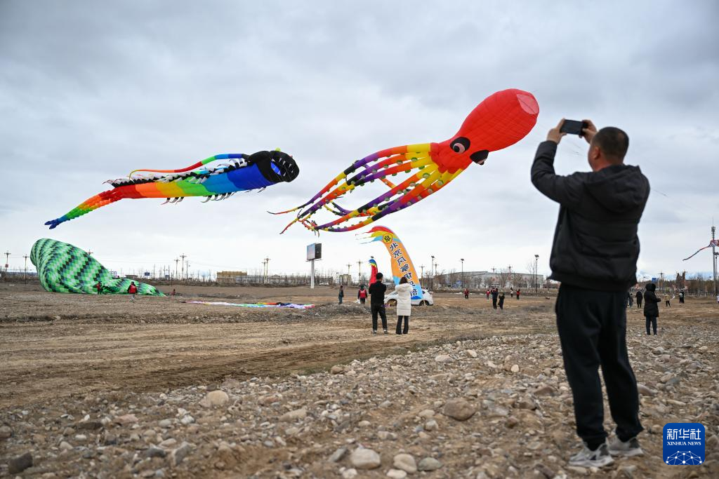3月8日,在新疆都拉塔口岸房车露营基地,当地群众拍摄放飞的风筝。