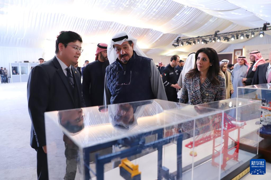 12月22日,在科威特杰赫拉省东北部布比延岛,科威特首相艾哈迈德(中)在签约仪式上观看中企项目模型。