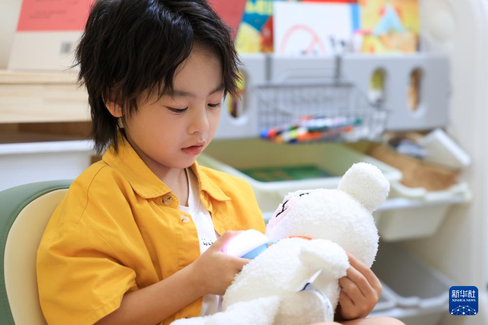 10月31日,在位于深圳的跃然创新科技有限公司Haivivi总部,一名儿童与该企业研发的AI玩具BubblePal互动。