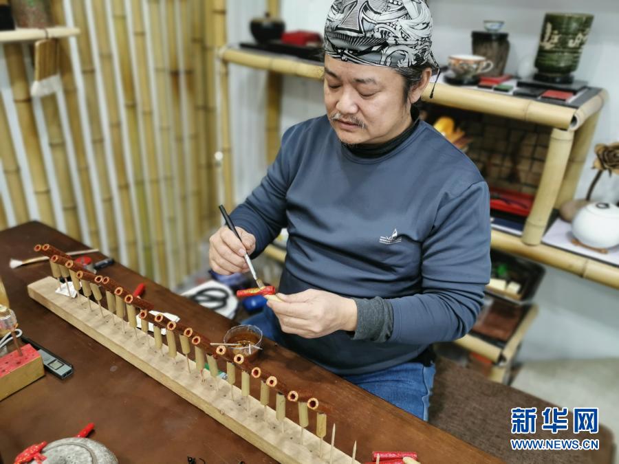 來自臺灣的大漆工藝師傅黃守堃在福州市臺江區(qū)的工作室給“鳥笛”上漆(1月11日攝)。新華社記者 凡帥帥 攝