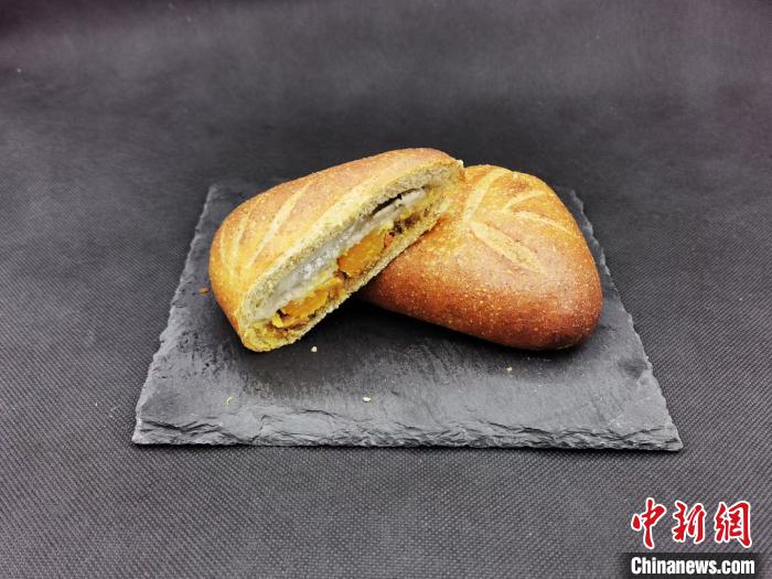 圖為黃婉菁制作的咸蛋黃芋泥肉松全麥面包。(周燕玲 攝)