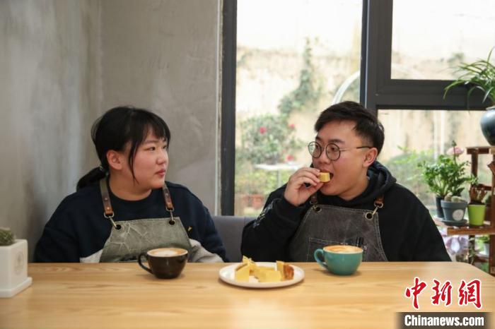 圖為閑暇時(shí),黃婉菁與王舟一起坐下來(lái)喝咖啡吃鳳梨酥。(周燕玲 攝)