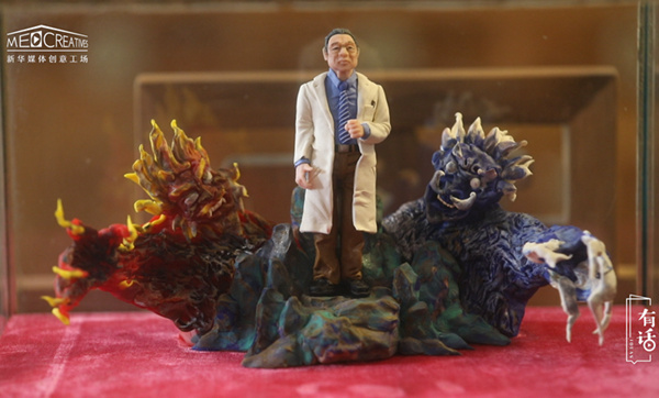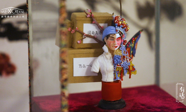 面塑俗稱面人,因為它主要的題材都是人物,所以老百姓們也管它叫面人。這個是“三八婦女節(jié)”那天做的,我看到當時有很多的醫(yī)護人員作為人類的代表跟另外一個物種去斗爭、保護我們,覺得她們還真的是很了不起的。想到以前巾幗英雄里邊穆桂英這個角色,加上京劇也是我們傳統(tǒng)文化中很寶貴的一個部分,就把這兩個結(jié)合在一起做了一個拼臉。
