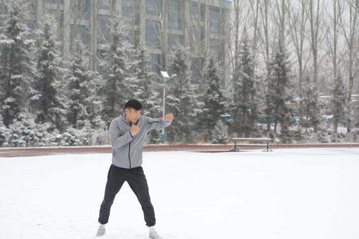 天微亮,田徑場(chǎng)上已鋪滿(mǎn)積雪。跑道中央站著一名身著灰色運(yùn)動(dòng)服的小伙兒,只見(jiàn)他向空氣中揮出一拳又一拳,地上也留下了一圈圈腳印……