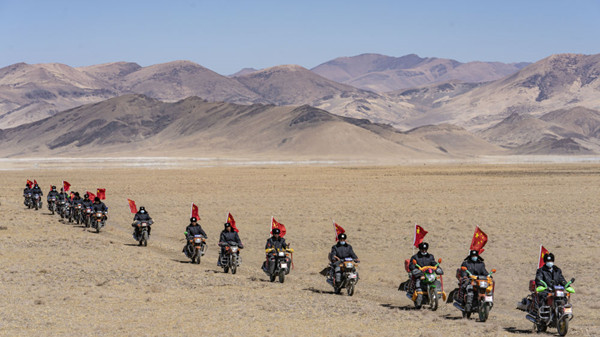 和高原的許多牧民一樣,石覺塔布是個“騎士”。從前,他騎馬放牧;現(xiàn)在,他騎摩托車守邊。作為昌果邊境派出所摩托車巡邏隊的隊長,這天,他要帶隊進(jìn)行邊境巡防訓(xùn)練。