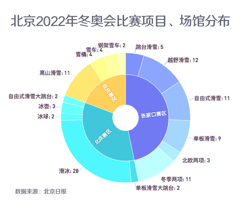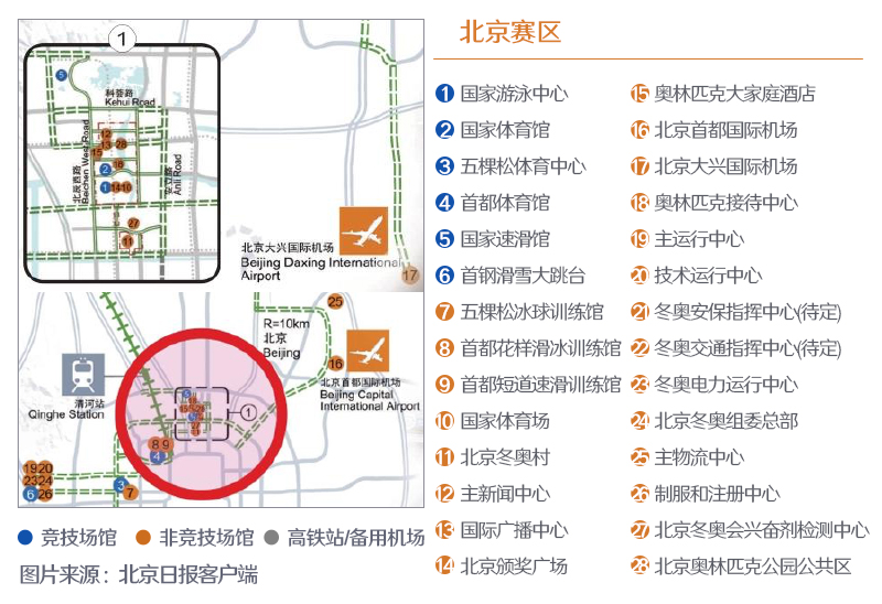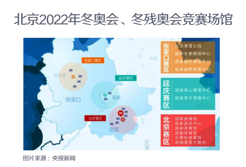 北京冬奧會設有北京、延慶和張家口三個賽區(qū),共計劃使用25個場館,其中直接用于賽事的競賽場館12個。