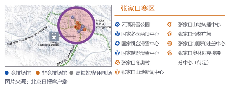 ??? 張家口賽區(qū)位于河北省張家口市崇禮區(qū),共有7個競賽和非競賽場館,其中4個為新建場館、1個為現(xiàn)有場館、2個為臨時場館。