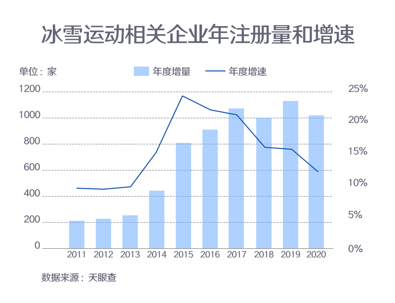 ??? 資料顯示,2015年7月31日,北京獲得2022年冬奧會舉辦權。同年,天眼查專業(yè)版數(shù)據(jù)顯示,冰雪運動相關企業(yè)年度注冊增速達到了歷史峰值(全部企業(yè)狀態(tài)),為24.4%。此后的幾年,冰雪運動相關企業(yè)總量仍呈上漲態(tài)勢。以工商登記為準,2020年我國共新增超過1,000家冰雪運動相關企業(yè)。