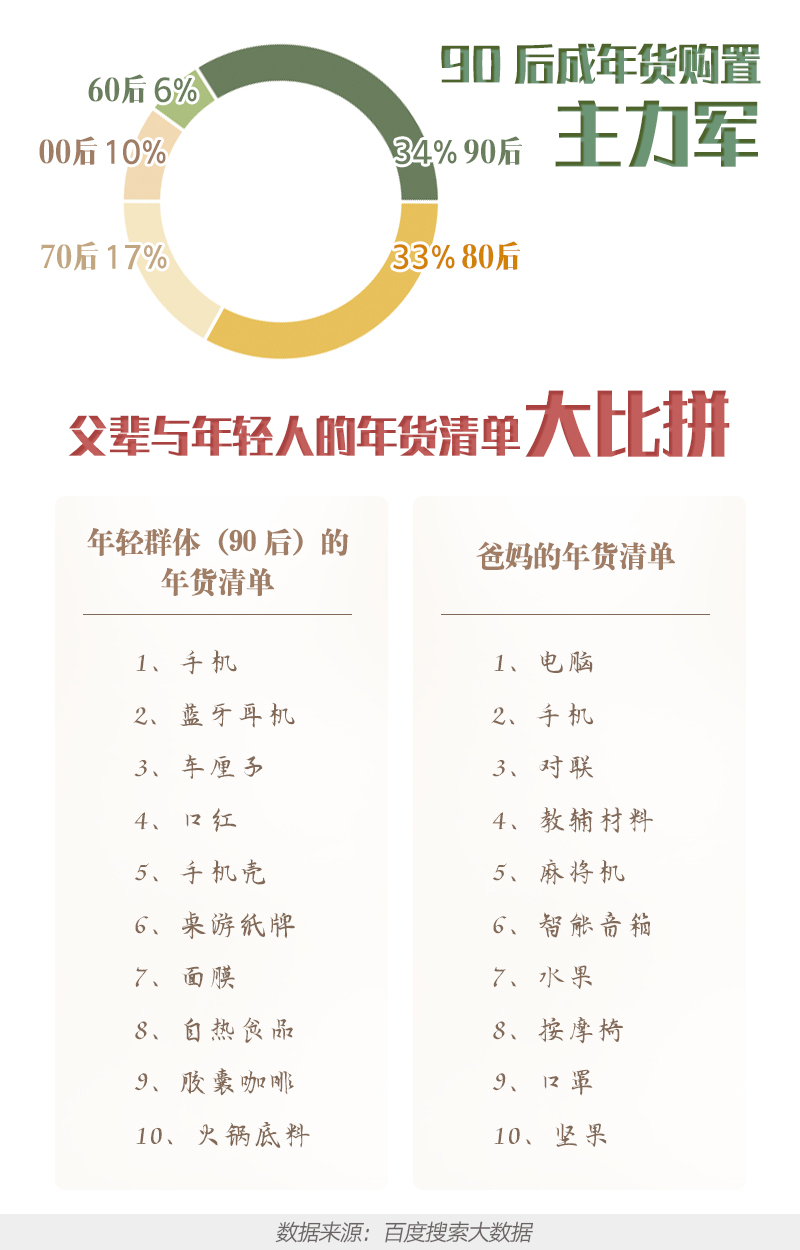 ??? 在青睞年貨的類型上,不同年齡段各有不同。百度搜索大數(shù)據(jù)顯示,以90后為代表的年輕群體的年貨清單集中為數(shù)碼產(chǎn)品、美妝與零食——手機、藍(lán)牙耳機與車?yán)遄拥乃阉麝P(guān)注度位列前三。
