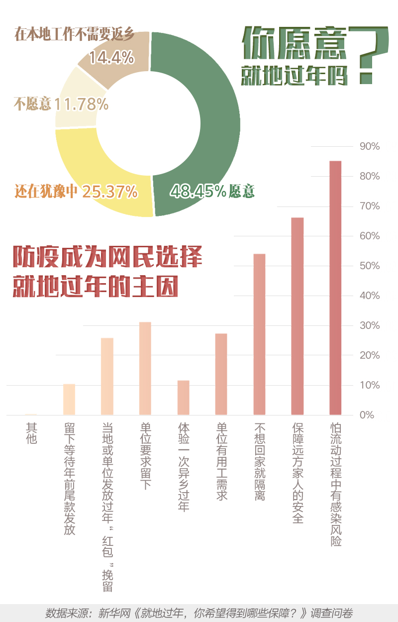 ??? “怕流動過程中有感染風(fēng)險”是受訪者選擇就地過年的主要原因,占比為85.11%?!氨U线h(yuǎn)方家人的安全(66.28%)”“不想回家就隔離(54.17%)”排在第二、第三位。安心就地過年,是每位留下的人對疫情防控的貢獻(xiàn)。
