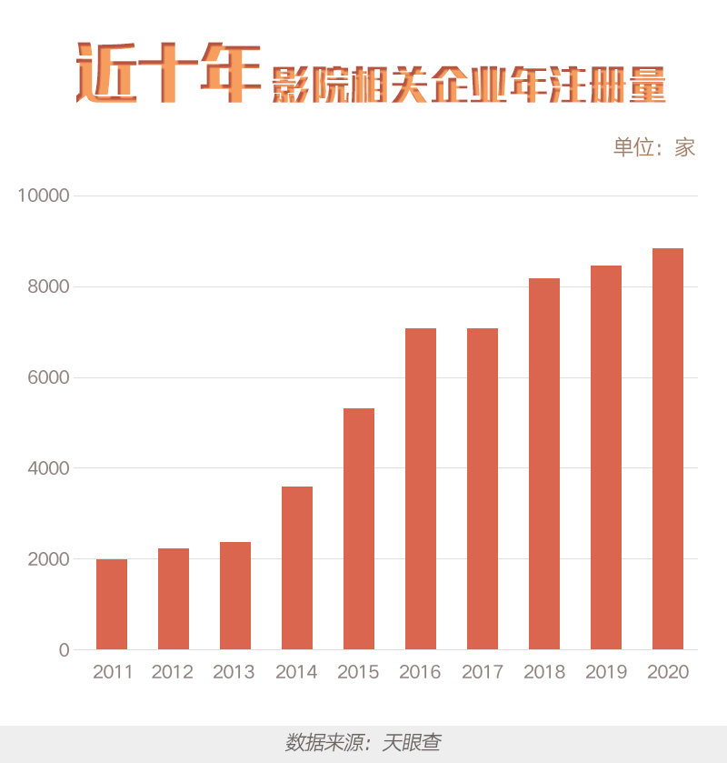 ??? 數(shù)據(jù)顯示,截至2月2日上午8時50分,春節(jié)檔電影預(yù)售總票房已達(dá)2.11億元。據(jù)天眼查大數(shù)據(jù)顯示,我國目前共有超過5.3萬家影院相關(guān)企業(yè)。其中,2020年,全國共新增超8,000家影院關(guān)聯(lián)企業(yè)。近年來,影院相關(guān)企業(yè)增速均保持在15%左右。分地域來看,全國多個一二線城市中,北京擁有的影院關(guān)聯(lián)企業(yè)最多,超3,700家,其次為深圳、廣州、上海和成都。