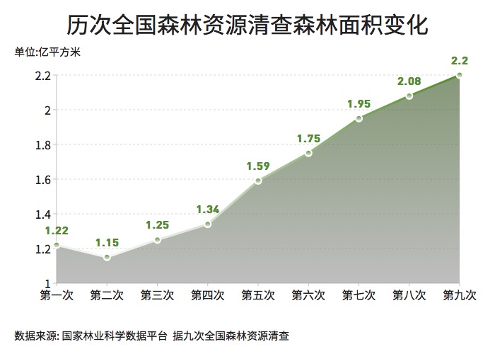 ??? 根據國家林業(yè)和草原局統(tǒng)計,目前全國森林面積達到2.2億公頃,森林覆蓋率23.04%。回望九次全國森林資源清查結果可以看出,我國的森林覆蓋率逐年穩(wěn)步提高。還有一些監(jiān)測數(shù)據顯示,近20年來中國新增植被覆蓋面積約占全球新增總量的25%,居全球首位。