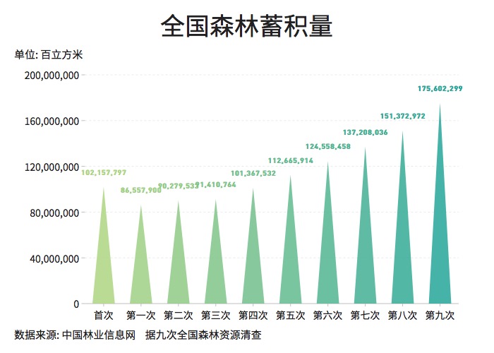 ??? 森林蓄積量是反映一個國家或地區(qū)森林資源總規(guī)模和水平的基本指標之一,也是反映森林資源的豐富程度、衡量森林生態(tài)環(huán)境優(yōu)劣的重要依據?!笆濉逼陂g,我國森林蓄積量超過175.6億立方米,森林植被碳儲量91.86億噸。