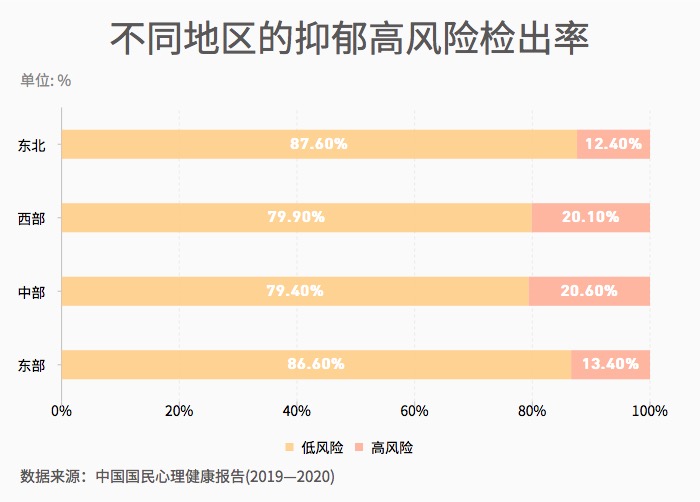 ??? 心理健康狀況受到地區(qū)經(jīng)濟發(fā)展、教育水平、醫(yī)療條件等諸多宏觀因素的影響,因此通常與這些宏觀因素一樣表現(xiàn)出地區(qū)差異。2020年度調(diào)查發(fā)現(xiàn),東部地區(qū)的總體心理健康水平更好。東部地區(qū)與東北地區(qū)的抑郁水平顯著低于中部和西部地區(qū),抑郁高風(fēng)險的檢出率顯著低于中部和西部地區(qū)。