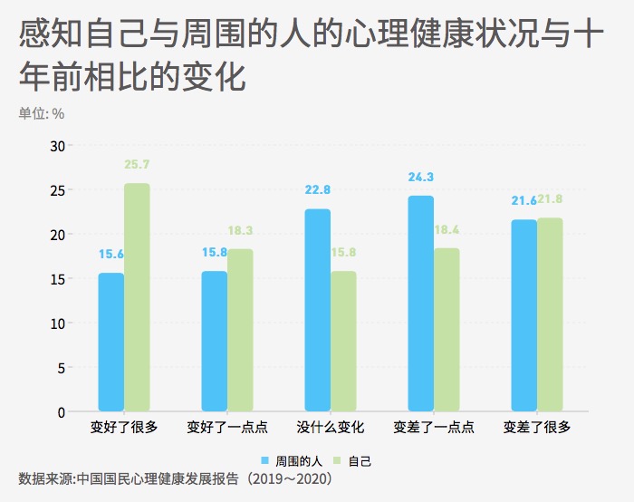 ??? 十年變遷感知調(diào)查對象認為,與十年前相比,周圍的人的心理健康狀況變好(“變好了很多”和“變好了一點點”)的比例為31.4%,認為“沒什么變化”的占22.8%,認為變差(“變差了一點點”和“變差了很多”)的占45.9%。總的來說,人們在看待身邊他人狀況的時候,認為總體心理健康水平比十年前有所下降。