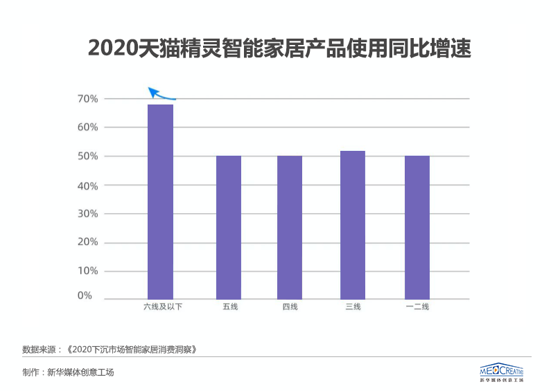 根據(jù)《2020下沉市場智能家居消費洞察》顯示,50%以上的天貓精靈智能家居使用者在三到六線城市,其中六線城市用戶增速最快,四線城市銷量、銷售額增長最快,下沉市場正在成為智能家居行業(yè)的新藍海。同時,根據(jù)天貓平臺數(shù)據(jù)顯示,智能開關、智能落地燈、智能電蒸箱等價格在50元到300元之間的小家電,在下沉市場年銷量同比增速均超過300%,也側(cè)面佐證著這一現(xiàn)象。