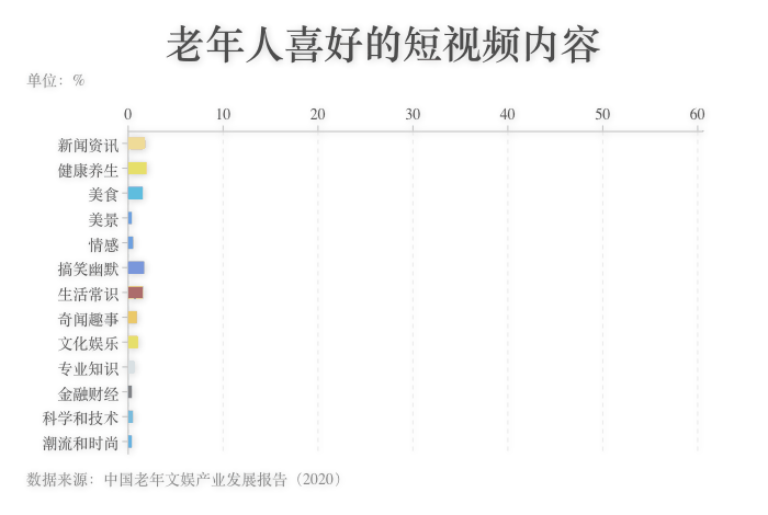 ????? 老年人群喜歡的短視頻內(nèi)容具有明顯的年代特征和生活氣息。健康養(yǎng)生、新聞資訊、搞笑幽默的內(nèi)容是很多老年群體首選觀看的短視頻內(nèi)容;其次,關(guān)于生活常識和美食的內(nèi)容也很受歡迎,歷經(jīng)風(fēng)霜的老年人群依舊喜好人間煙火味兒。