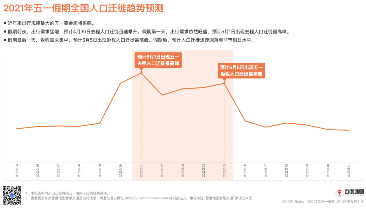 ????? 今年“五一”假期繼續(xù)延續(xù)“加長版”,5天長假點燃了眾多消費者的出游熱情。根據(jù)中國旅游研究院的預(yù)測,今年“五一”國內(nèi)旅游出游有望達到2.2億人次,按可比口徑甚至超過疫前同期水平。根據(jù)百度地圖《2021年五一假期出行預(yù)測報告》,近年來出行規(guī)模最大的“五一”黃金周將來臨。預(yù)計5月1日出現(xiàn)五一去程人口遷徙最高峰。