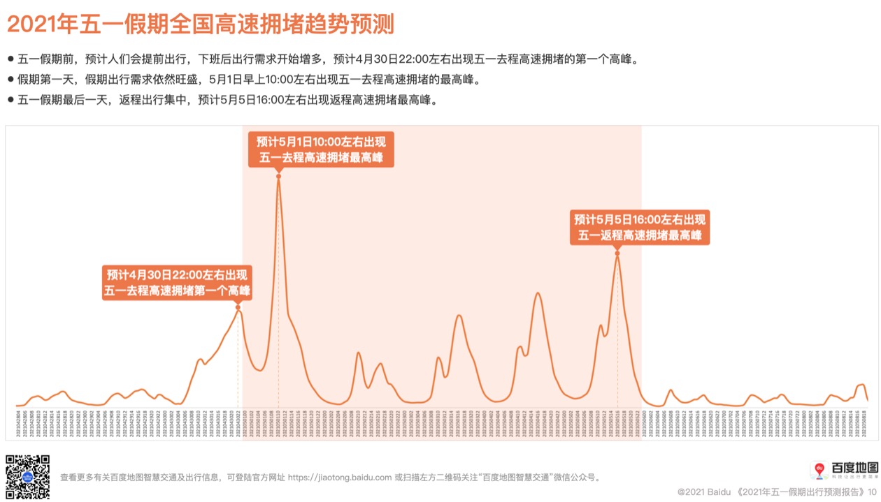 ????? 假期前,預(yù)計人們會提前出行,下班后出行需求開始增多,預(yù)計4月30日22:00左右出現(xiàn)五一去程高速擁堵的第一個高峰。