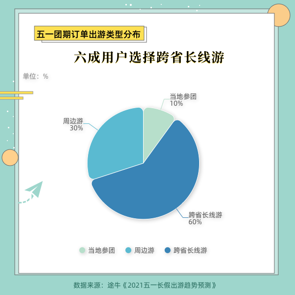 ????? 《報告》顯示,截至目前,預(yù)訂出游的訂單中,有60%為跨省長線游,其中,有37%的訂單行程天數(shù)超過5天,拼假出游的游客不在少數(shù)。