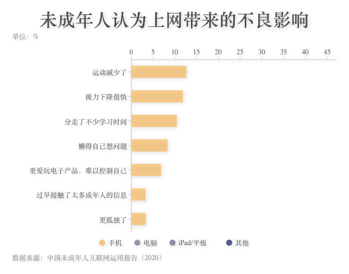 ????? 近年來,青少年使用電子產(chǎn)品機會和上網(wǎng)時間的增多,也直接導(dǎo)致了許多兒童身體素質(zhì)下降和視力損害。調(diào)查顯示,未成年人認為不同終端上網(wǎng)帶來的不良消息影響中,“視力下降很快”和“運動減少”這兩項占的比例最高。