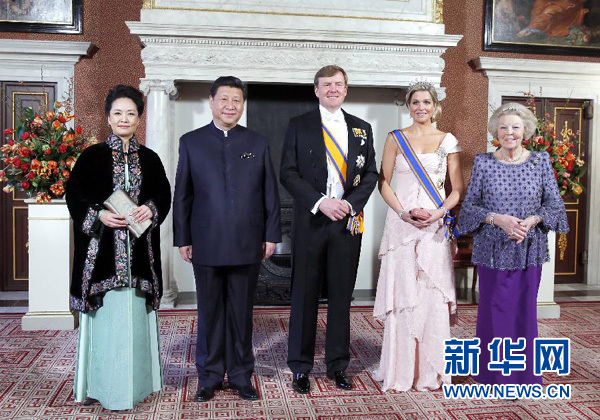 ??? 3月22日,國(guó)家主席習(xí)近平在阿姆斯特丹會(huì)見(jiàn)荷蘭國(guó)王威廉-亞歷山大。當(dāng)晚,威廉-亞歷山大國(guó)王在王宮為習(xí)近平舉行盛大國(guó)宴。威廉-亞歷山大國(guó)王、馬克西瑪王后、貝婭特麗克絲前女王共同迎接習(xí)近平和夫人彭麗媛到來(lái)。新華社記者鞠鵬攝