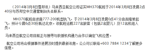 ????這份聲明標(biāo)記的時間為3月24日晚上10時15分。而在3月8日,馬航發(fā)表的聲明則表示“該航班運載227名旅客(包括2名嬰兒)及12名機(jī)組人員?!?/p>