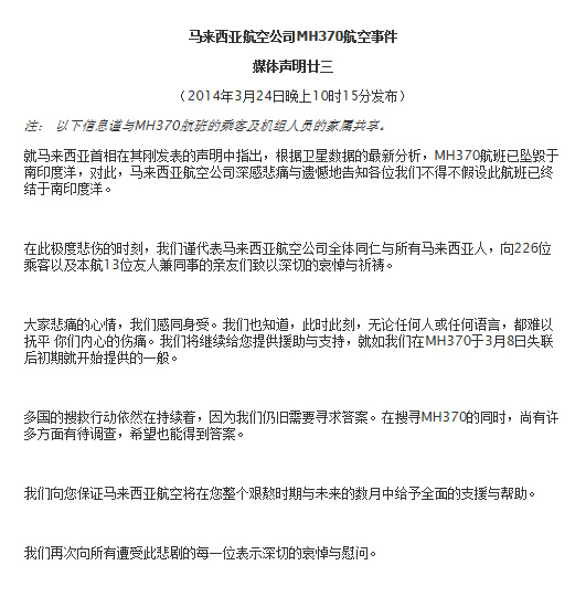 ????馬航官方網(wǎng)站上的《媒體聲明廿三》表示,“在此極度悲傷的時刻,我們謹(jǐn)代表馬來西亞航空公司全體同仁與所有馬來西亞人,向226位乘客以及本航13位友人兼同事的親友們致以深切的哀悼與祈禱?!?/p>