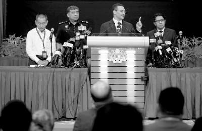 昨天,馬方發(fā)布會(huì)在吉隆坡舉行,代理交通部長(zhǎng)希沙姆?。ㄗ笕┰诎l(fā)布會(huì)上答記者問(wèn)。中新社發(fā)