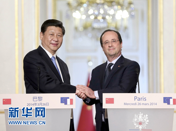 ????兩國元首還共同會見了記者。習近平表示,50年前,中法兩國沖破層層阻隔,實現(xiàn)歷史性握手,在國際關(guān)系史和東西方交流史上寫下濃墨重彩的一筆。這一歷史性事件體現(xiàn)出的互尊互信、平等相待、開放包容、互利共贏精神,至今仍具有重要時代意義。我同奧朗德總統(tǒng)共同規(guī)劃了兩國關(guān)系發(fā)展的方向和重點,決定將發(fā)展中法關(guān)系作為各自外交優(yōu)先取向。我們要攜手合作,共同開創(chuàng)緊密持久的中法全面戰(zhàn)略伙伴關(guān)系新時代,繼續(xù)引領(lǐng)中歐關(guān)系和中國同西方國家關(guān)系發(fā)展。我對中法友好的未來發(fā)展更加充滿信心。