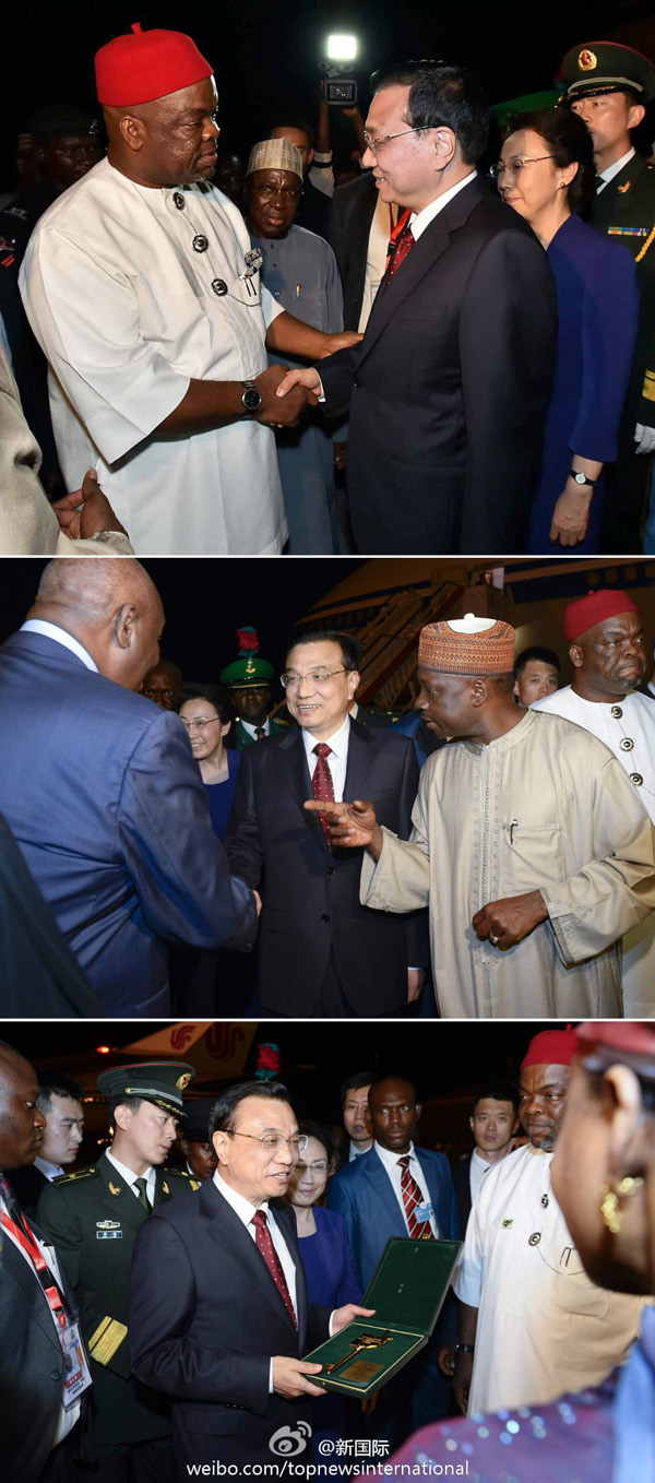 新華網(wǎng)北京5月7日電? 據(jù)新華社“新國際”微博報道,國務院總理李克強6日晚抵達阿布賈,開始對尼日利亞進行正式訪問并出席第24屆世界經(jīng)濟論壇非洲峰會全會。夫人程虹同機抵達。尼外交部長、勞工部長到機場迎接,聯(lián)邦首都區(qū)部長按照接待尊貴客人的傳統(tǒng)禮儀,向李克強贈送了阿布賈城市鑰匙,熱烈歡迎中國總理到訪。